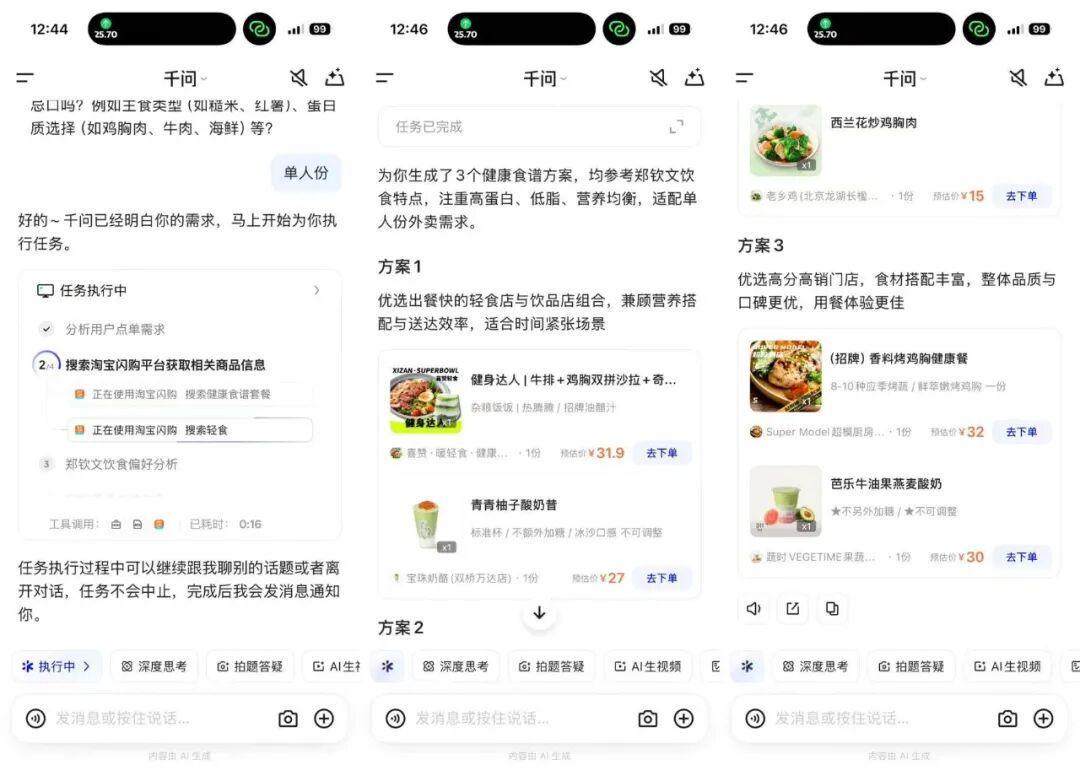 举个例子,通过千问,郑钦文的粉丝不仅可以生成一份「冠军同款」的入门版训练计划和饮食方案,还可以根据你的具体训练安排,一站下单健康轻食外卖,或帮你搜索、筛选并导航到合适的网球场地。